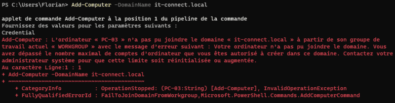 avez dépassé le nombre maximal de comptes d’ordinateur que vous êtes autorisé à créer dans ce domaine.". En utilisant un compte Administrateur du domaine, cela fonctionne toujours !