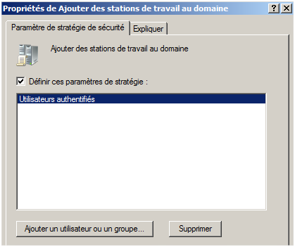 Dans la stratégie "Default Domain Controllers Policy", le paramètre « Ajouter des stations de travail au domaine » est défini et permet à tous les utilisateurs authentifiés sur le domaine d’ajouter et de retirer des machines du domaine.