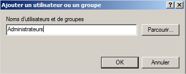 Il faut désormais ajouter le groupe « Administrateurs » dans la liste. Cliquez sur « Ajouter un utilisateur ou un groupe » et saisissez « Administrateurs » et cliquez sur « OK ».