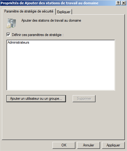 Grâce à la modification de cette stratégie de groupe, les utilisateurs du domaine ne peuvent plus ajouter de machines au domaine même si le quota n'est pas modifié ("ms-DS-MachineAccountQuota"). Néanmoins, gardez à l'esprit qu'il vaut mieux éviter de modifier les GPO par défaut et que la modification du quota comme expliqué en première partie suffira à restreindre l'ajout de machines au domaine. Si vous avez besoin d'autoriser des comptes non-administrateurs, vous devez mettre en place une délégation de contrôle Active Directory sur une ou plusieurs unités d'organisation.