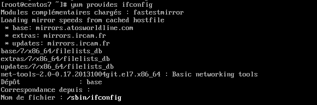Pour retrouver l'utilisation d'ifconfig et des commandes associées pour la gestion du réseau, il faut retrouver le nom du paquet contenant cette commande. La commande yum propose une option permettant de retrouver un paquet en fonction de la commande que l'on cherche, plutôt pratique ! Utilisez l'option "provides" comme suivant :