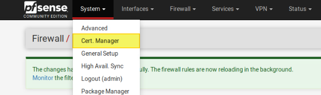Pour créer une autorité de certification, accédez au menu "System" puis "Cert. Manager".