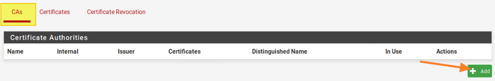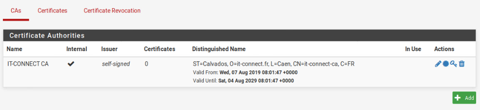 Qui dit HTTPS, dit certificat SSL pour sécuriser les connexions. Dans le cadre de la publication d'un site Internet, il faut utiliser un certificat SSL qui émane d'une autorité de certification de confiance et reconnue nativement au sein des navigateurs clients. S'il s'agit d'un extranet et que vous souhaitez générer un certificat directement depuis pfSense, il est possible de créer une autorité de certification.