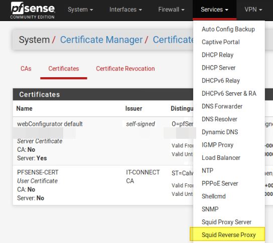 Nous devons indiquer au reverse proxy quel certificat il doit utiliser pour le traitement des flux HTTPS. Sous "Services", retournez dans "Squid Reverse Proxy".