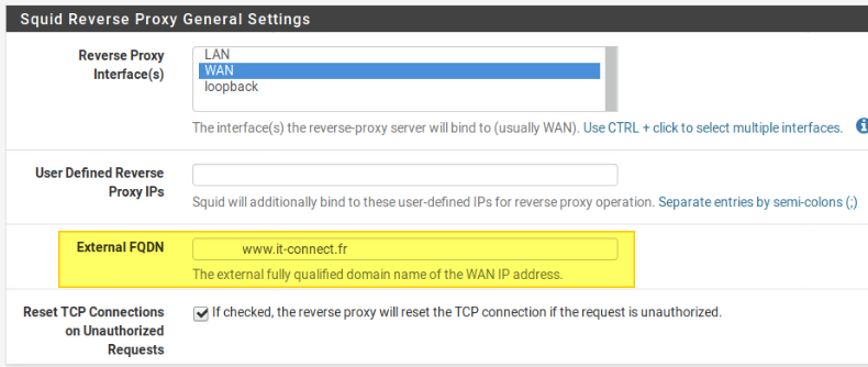 Maintenant, au niveau des paramètres généraux, indiquez que le reverse proxy écoute sur l'interface WAN et si vous hébergez un seul site web, vous pouvez indiquer directement son nom de domaine pour le champ "External FQDN".