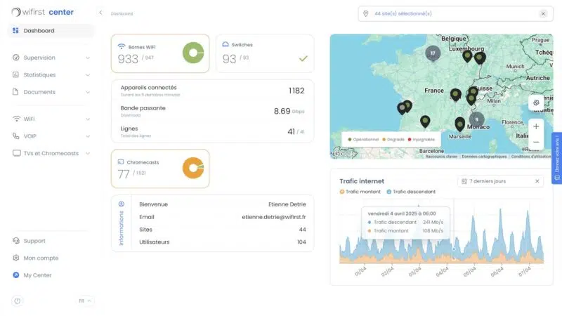 Finie la dispersion ! Le Wifirst Center est une véritable tour de contrôle centralisée pour l'ensemble de vos services télécoms. WiFi, Chromecast, Téléphone IP, IPTV... tout est désormais supervisé et géré depuis une interface unique et intuitive. Cette approche tout-en-un élimine la complexité et le temps perdu à naviguer entre différentes consoles, offrant aux responsables IT une vue d'ensemble précieuse et un contrôle sans précédent sur leur écosystème numérique.