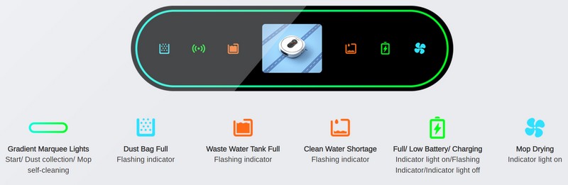 Pour faciliter la gestion et la maintenance de l'appareil, des voyants d'état sont visibles sur la façade de la station de charge. Ainsi, s'il faut vider le réservoir avec l'eau usée ou vider le sac à poussière, ce sera facilement visible !