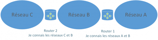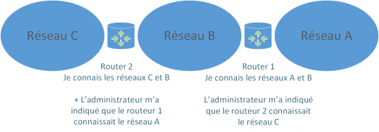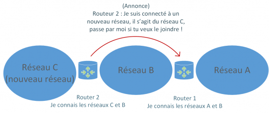 On voit ici que dans un premier temps, on ajoute le réseau C au routeur 2 (on le connecte à l'interface du routeur 2). Une annonce va ensuite suivre pour que les autres routeurs sachent que le réseau C est joignable via le Routeur 2. Par la suite , les routeurs continuerons à communiquer périodiquement pour voir si chacun des routeurs est toujours joignable. Si un routeur vient a tomber et qu'une autre route existe pour accéder à un réseau, les tables de routages des routeurs vont se modifier dynamiquement via des communications faites entres les routeurs et le calcul de la meilleur route possible à emprunter. Cela facilite la transmission des informations entre les routeurs et la mise à jour des topologies réseaux. On doit bien sûr pour cela définir la façon dont ils vont communiquer et calculer les routes (le protocole de routage qu'ils doivent utiliser). Ils pourront ensuite se comprendre par l'échange de messages de mise à jour, des messages "hello" (indiquant que l'hôte est toujours joignable), des requêtes et des réponses diverses et différentes selon le protocole de routage.