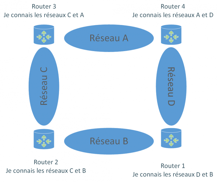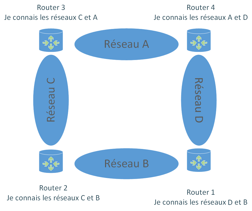 Le routage dynamique permet quant à lui de se mettre à jour de façon automatique. La définition d'un protocole de routage va permettre au routeur de se comprendre et d'échanger des informations de façon periodique ou événementielle afin que chaque routeur soit au courant des évolutions du réseau sans intervention manuelle de l'administrateur du réseau. Concrètement, le protocole de routage fixe la façon dont les routeurs vont communiquer mais également la façon dont ils vont calculer les meilleurs routes à emprunter. Nous verrons un peu plus bas qu'il existe pour cela deux méthodes mais avant voici un schéma qui illustre le routage dynamique :