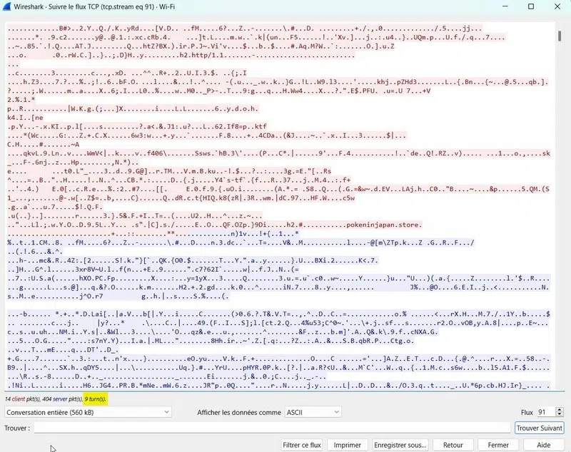 Sélectionnez un paquet, effectuez un clic droit et allez sur « Suivre » puis « TCP stream ».