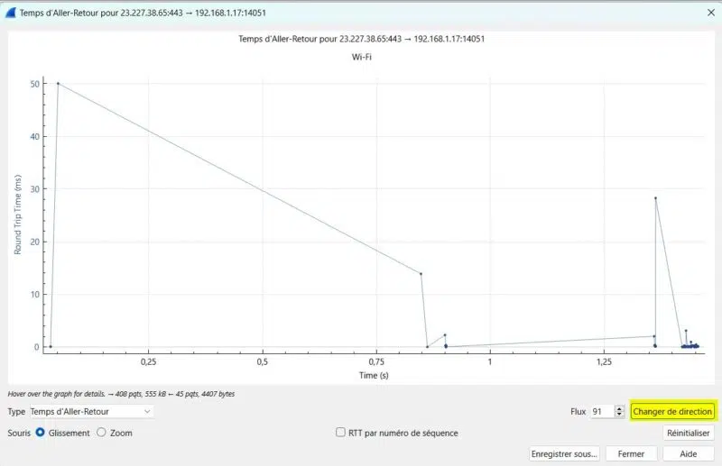 Dans l’image ci-dessus, on aperçoit sur l’axe vertical le temps du RTT réseau qui est à 50 ms maximum dans le sens "site web vers mon ordinateur". Vous pouvez changer de sens à tout moment en cliquant sur le bouton « Changer de direction ».