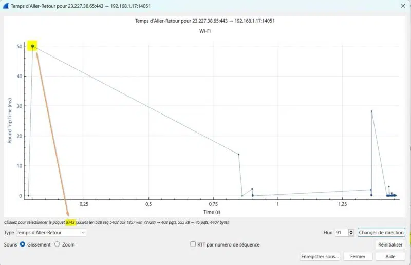 Comment savoir quel paquet a remonté les 50 ms de RTT réseau ? Positionnez votre curseur sur le point et en bas, apparaitra le paquet qui a remonté 50 ms de RTT réseau.