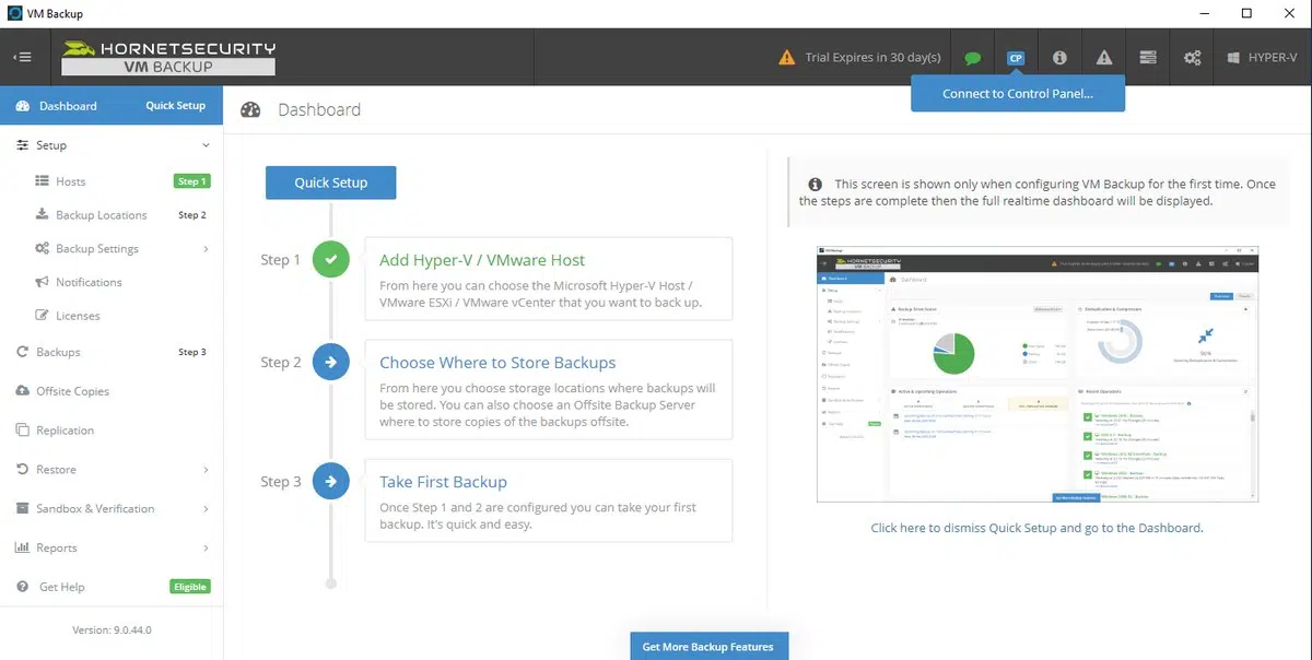 VM Backup 9 est une solution destinée à sauvegarder deux types d'environnements virtualisés : ceux sous VMware et ceux sous Hyper-V. D'ailleurs, Hornetsecurity est partenaire avec VMware et Microsoft (Gold).