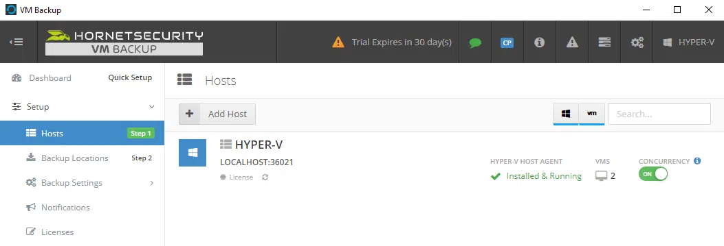 La première étape consiste à déclarer l'hôte qui contient les machines virtuelles à sauvegarder. Ici, c'est l'hôte local alors il est automatiquement détecté. Cette section indique l'état de la licence sur cet hôte, l'état de l'agent VM Backup, ainsi que le nombre de VMs sur l'hôte.
