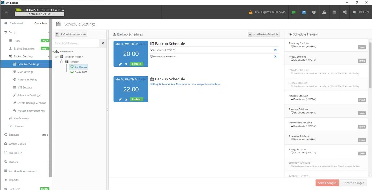 La section "Schedule Settings" correspond à la planification. Sur le même principe que pour associer les VMs aux destinations pour les sauvegardes, ici on doit associer les VMs aux éléments de type "Backup Schedules" visibles au centre de la fenêtre. Un simple glisser-déposer permet d'associer une VM avec la planification de votre choix. Ensuite, si l'on sélectionne une VM, le bandeau latéral présent sur la droite affiche une prévisualisation du planning de sauvegarde pour la VM sélectionnée.