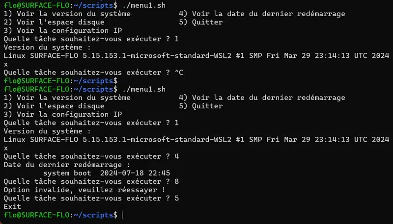 Désormais, si nous faisons un choix et que nous appuyons sur Entrée, l'instruction correspondante est bien exécutée. Si l'option n'est pas reconnue, une erreur est retournée et nous sommes invités à faire un nouveau choix. Enfin, si le choix "5" est fait, nous quittons le script.