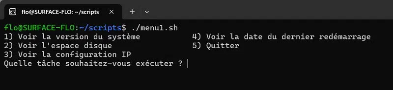 Nous allons illustrer cette méthode par la création d'un menu permettant à l'utilisateur de choisir d'afficher différentes informations au sujet de la machine locale : la version du système, l'espace disque, la configuration IP et la date du dernier redémarrage de la machine. Pour cette démonstration, Ubuntu via WSL est utilisé, mais il suffit de disposer de Bash.