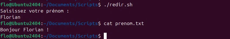 echo "Bonjour $prenom !" > prenom.txt