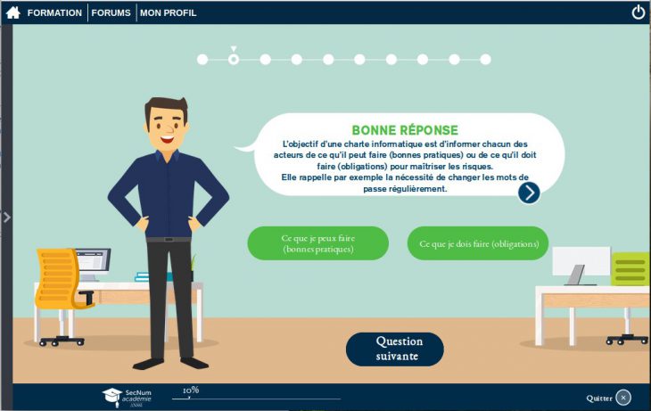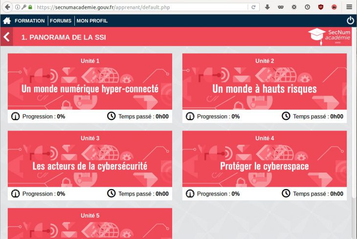 Je n'ai pas connaissance de la délivrance d'un certifcat à la fin des formations proposées par l'ANSSI sur cette nouvelle plateforme en ligne, cependant je note qu'il peut s'agit d'une base intéressante et concrète pour la sensibililsation au sein des entreprises. On peut par exemple imaginer qu'il soit nécessaire d'avoir un certaines taux de réponses valides pour accéder à certains postes à responsabilités qui amèneraient le salarié à accéder à des informations sensibles pour son entreprise.