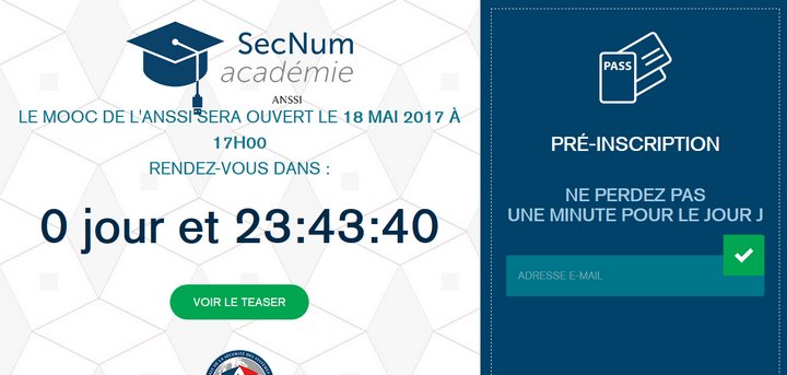 A compter de son lancement le jeudi 17 mai 2017, le MOOC restera en ligne pour une période de 3 ans et vous pouvez dès à présent vous inscrire : https://secnumacademie.gouv.fr/