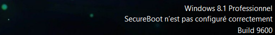 Sous Windows 8.1, il se peut qu'un filigrane s'affiche sur votre bureau et vous indique "SecureBoot n'est pas configuré correctement", mais alors qu'est-ce que c'est ?! SecureBoot est une fonctionnalité utilisable votre machine en configurant l'UEFI (successeur BIOS), elle permet de sécuriser le démarrage de votre machine en s'assurant qu'aucun élément indésirable vienne perturber son démarrage, cela peut impliquer le blocage d'éventuel virus/malware qui affectent le démarrage de la machine (rootkit).