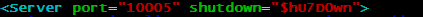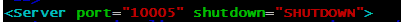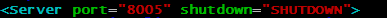 Nous allons ensuite nous rendre dans le fichier de configuration de Tomcat pour aller modifier la ligne de l'élément serveur "shutdown". On changera cet élément pour y mettre le numéro de port que l'on souhaite lui allouer. Mettons par exemple "10005" :