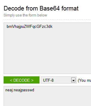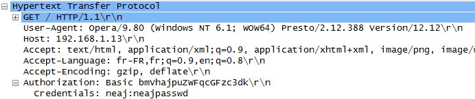 Nous voyons bien ici dans la partie "HTTP" du paquet les credentials ("identifiants") envoyés par le client (192.168.1.14) au serveur (192.168.1.13). Le mode d'authentification "Basic" encode les identifiants (bmVh ...) mais d'une façon si simple que WireShark les décodes automatiquement pour nous afficher les vrais identifiants (login : neaj, mot de passe : neajpasswd). L'encodage en base 64 est un procédé servant à coder du binaire en ASCII et inversement. Nous pouvons très simplement avec un décodeur récupérer manuellement la chaine encodée et la décodée comme suivant :