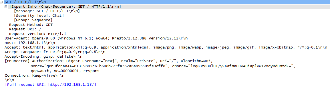 On voit donc bien l'échange fait entre les machines, d'abord l'initialisation de la communication sur les trois premiers paquets, la demande d'authentification ("Authorization Required") sur le paquet n°22 et enfin le paquet où les identifiants sont échangés au paquet n°34. Regardons d'un peu plus prés le contenu de ce paquet :