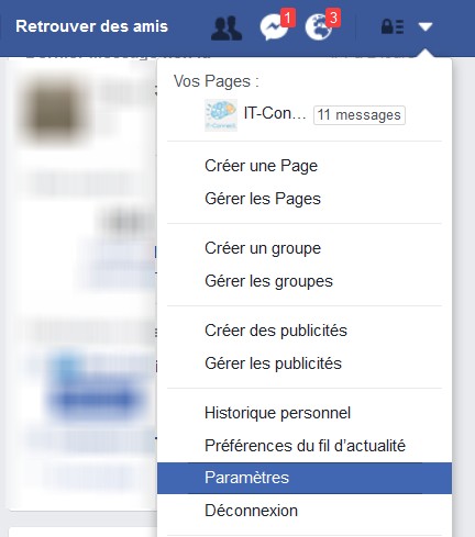 Commencez par vous connecter à votre compte Facebook, cliquez sur la flèche du menu en haut à droite puis "Paramètres".