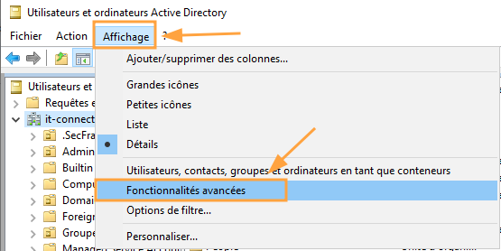 Au sein de l’interface "Utilisateurs et Ordinateurs Active Directory", il faut accéder à l’affichage "Fonctionnalités avancées" pour pouvoir afficher l’onglet "Sécurité" dans les propriétés d’un objet :