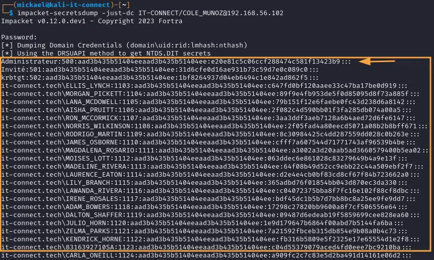 En retour, l’outil récupère les hashs des mots de passe de tous les utilisateurs du domaine, incluant celui de l’administrateur du domaine.