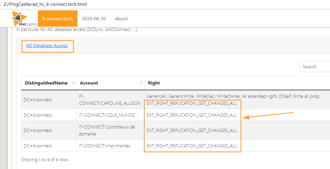 Voici à quoi ressemble la détection des permissions DCSync dans le rapport web de PingCastle (Section "Admin Groups > Delegations > AD Database Access") :