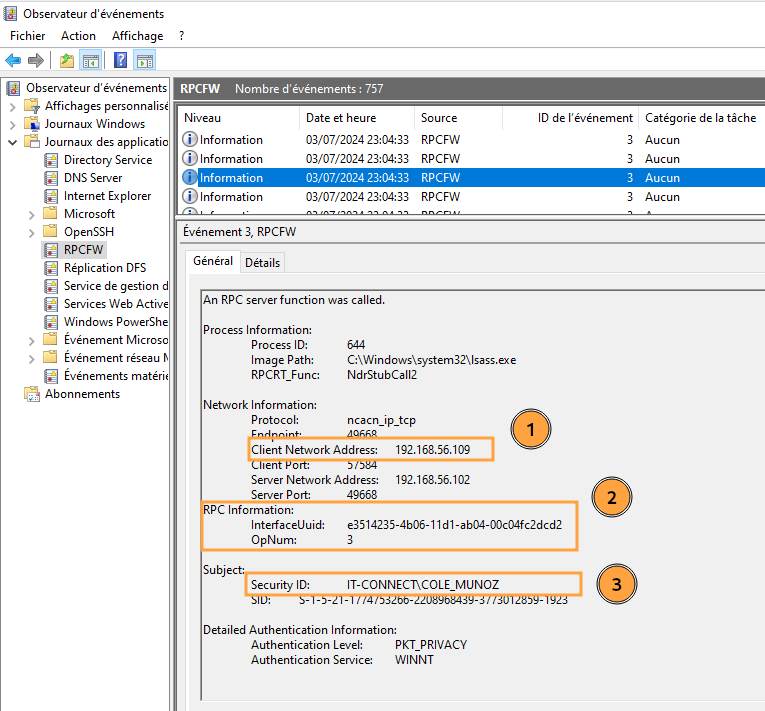On retrouve ici (1) l’adresse IP du système ayant effectué la demande de réplication, (2) l’UUID du service RPC requêté et (3) le nom de l’utilisateur authentifié ayant effectué la requête. Cela nous permet donc de voir plus facilement qu’une adresse IP n’étant pas un contrôleur de domaine a effectué une demande de synchronisation auprès du service DSRUAPI. Ces différents éléments pourront alors facilement être utilisés pour lever une alerte au sein d’un SIEM.