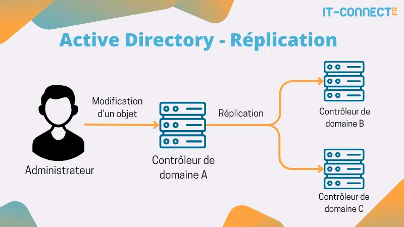 Lorsqu’un contrôleur de domaine souhaite obtenir la liste des dernières modifications sur les objets de l’Active Directory auprès d’un autre, il va simplement effectuer une demande de synchronisation, que l’on nomme également dans l’environnement Active Directory "réplication".