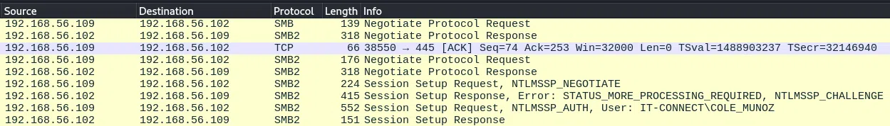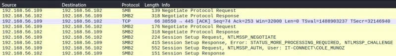 On observe dans un premier temps une authentification NTLM classique (challenge/response), suivie d’échanges RCP sur le port TCP/135 :
