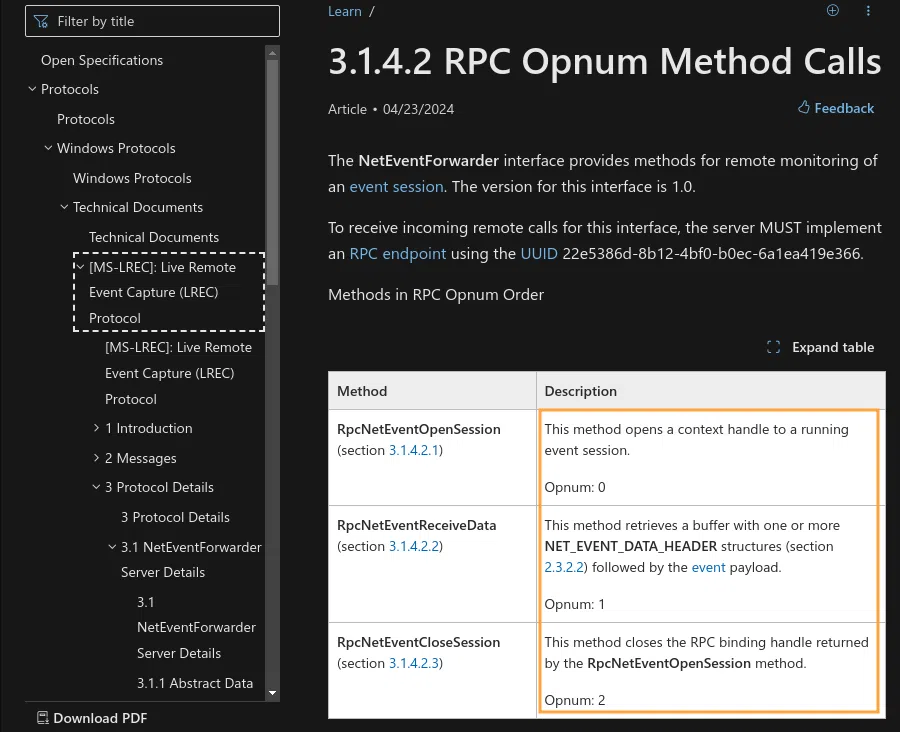Notez également le champ RPC Information, qui contient l’interface RPC cible de la requête (son UUID, identifiant unique) et l’OpNum. Dans le contexte d’un appel RPC, l’OpNum permet de spécifier la méthode que l’on souhaite appeler sur l’interface désignée. Voici, par exemple, la description des OpNums de l’interface RPC MS-LREC (Live Remote Event Capture, source) :