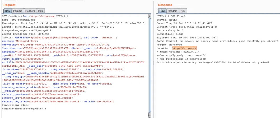 Le premier cas concerne une vulnérabilité découverte sur le site Semrush (Source : Hackerone/report/311330). Ici, l’utilisation simple et classique du paramètre "?url=" en indiquant un nom de domaine tiers suffisait à rediriger l’utilisateur vers le site web voulu par l’attaquant :