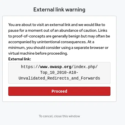 - Avertir l’utilisateur qu’il quitte votre application web : dans le cas où l’utilisation d’une fonction de redirection sans restriction est intentionnelle, il est conseillé de mettre en place une page intermédiaire d’avertissement à l’utilisateur, afin qu’il soit bien au courant qu’il se dirige vers une autre application. C’est, par exemple, ce qui est proposé par le site HackerOne et de nombreux autres (exemple avec ce lien) :