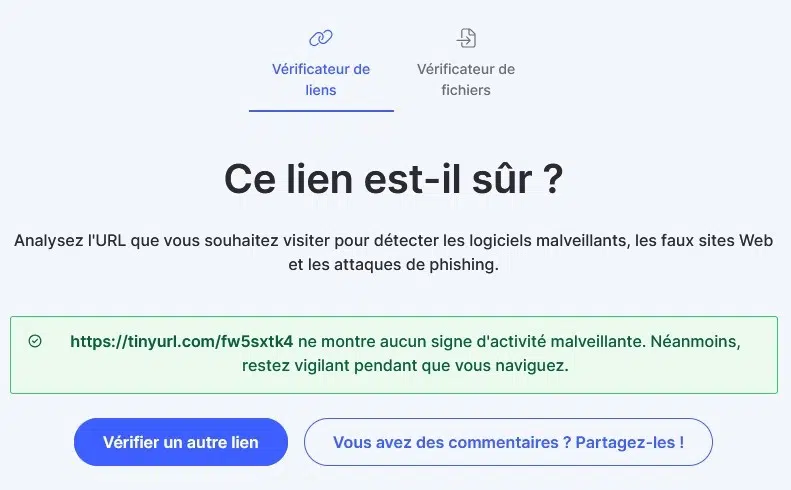 - Vérifiez le lien avec un outil en ligne, c’est une façon rapide et efficace d’avoir un avis, ce qui ne vous empêche pas de faire votre propre analyse, bien au contraire.