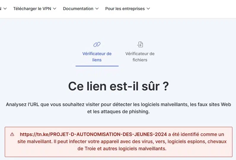 Je copie le lien présent dans ce message WhatsApp et je me rends sur le site de vérification de NordVPN. Une fois sur la page de vérification, j’entre le lien dans la barre d’analyse, puis je clique sur le bouton « Analyser ». Je reçois ce message me disant que le lien mène vers un site malveillant.