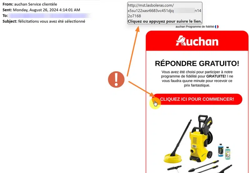 Dans cet exemple, le lien est positionné sur l’image et l’utilisateur est invité à cliquer sur l’image. Si l’on positionne la souris sur l’image, nous pouvons avoir un aperçu du lien. L’URL « http://mst[.]lasboleras[.]com » est suspecte et n’a rien à voir avec Auchan. De plus, le protocole non sécurisé « http » est utilisé dans l’URL, alors que la grande majorité des sites sont accessibles en « https », dont le « s » est synonyme de connexion sécurisée. Dans le même esprit, vérifiez l’adresse e-mail de l’expéditeur.