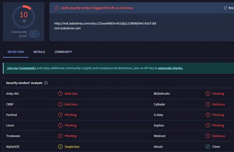 Nous pouvons finir par l’analyse du lien avec un outil en ligne, par exemple, via VirusTotal. Ce lien est considéré comme malveillant par 10 solutions de sécurité différentes, ce qui confirme nos doutes.