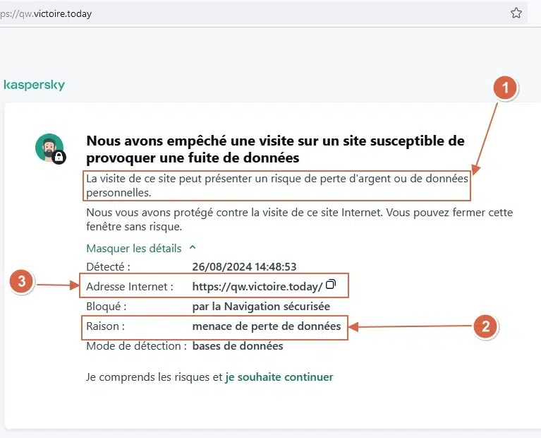 Dans le cas présent, en cliquant sur le lien, mon anti-malware me confirme ainsi que je pourrais me faire voler mes données ou les perdre (souvenez-vous qu’il est demandé dans le message de mon ami de cliquer sur le lien afin d’avoir accès à un formulaire permettant d’y introduire ses données).