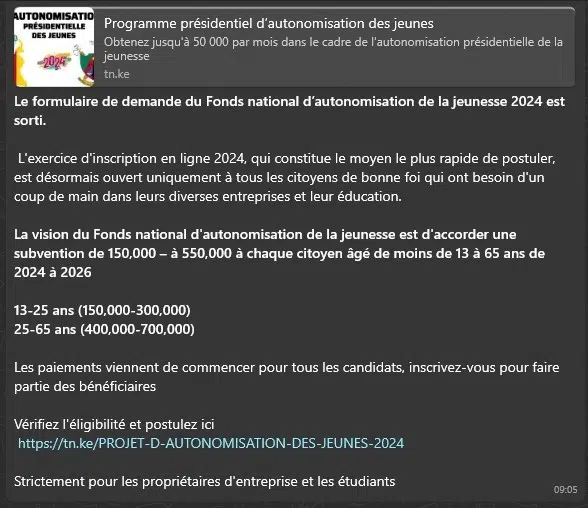 Prenons cet exemple : il y a quelques semaines de cela, je recevais ce message WhatsApp de l'un de mes amis, qui soit dit en passant, viendrait de la part de la Présidence de la République du Cameroun. Dans ce message, cette institution accorderait des subventions aux entrepreneurs et étudiants, en demandant de cliquer sur un lien présent dans ce message afin d’y bénéficier. J’ai pris la peine de capturer ce message, pour alimenter ce tuto.