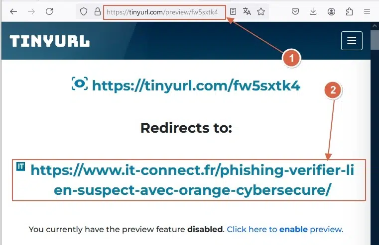 Pour se rassurer qu’il s’agisse effectivement du lien réduit de l’article, on n’a qu’à préfixer le nom de domaine « tinyurl.com » présent dans le lien réduit avec l’expression « preview » après l’avoir saisi dans la barre d’adresse du navigateur. Ce qui dans notre cas, donne l'adresse "https://preview.tinyurl.com/fw5sxtk4" et on valide. Si tout est ok, on devrait avoir le véritable lien menant à notre article sur IT-Connect comme sur cette image.