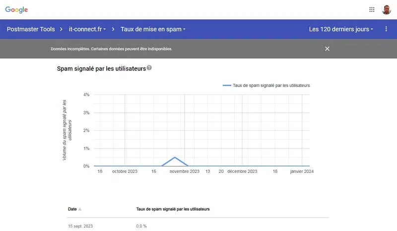 Le graphique ci-dessous montre le "Taux de spam signalé par les utilisateurs", sur les 120 derniers jours pour un domaine spécifique dont vous êtes le propriétaire.