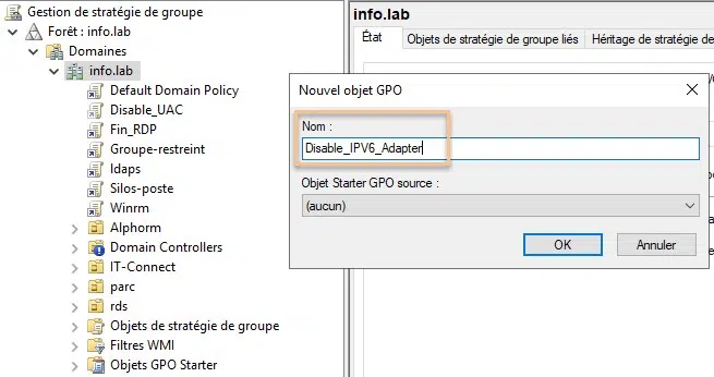 Nous avons appelé notre GPO "Disable_IPV6_Adapter". De votre côté, respectez la convention de nommage dans votre entreprise.