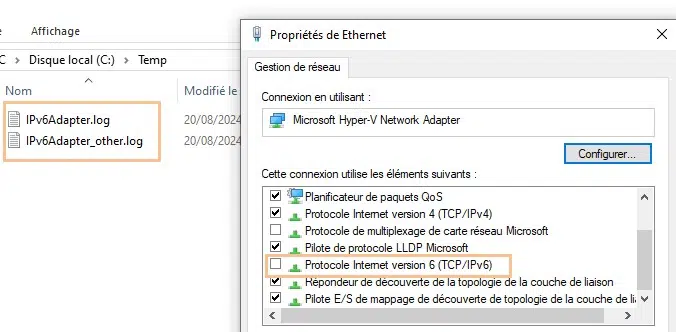 Une fois la machine redémarrée, nous remarquons que le protocole a bien été décoché sur les cartes réseaux ! De plus, un fichier de log a été créé dans le dossier « C:\temp » de la machine sur laquelle s’est exécutée le script.