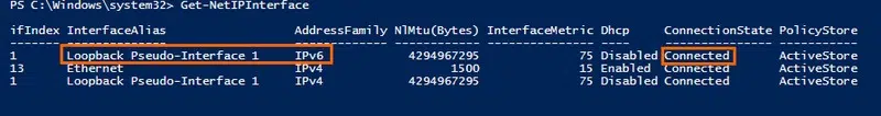 L'utilisation de la commande « Get-NetAdapter » liste uniquement les cartes réseau physiques, en ignorant les cartes virtuelles comme le loopback. Cette approche est recommandée pour éviter toute déstabilisation du système. Pour vous assurer que l'interface loopback IPv6 est toujours active, vous pouvez vérifier son état avec la commande suivante, en vous assurant que l'interface "Loopback" est bien en mode "Connected" :