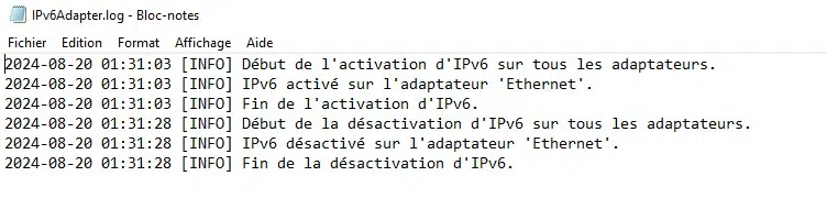 -Quand on utilise la fonction Enable-IPv6Adapter cela écrit « IPv6 has been disabled on adapter ‘$adapterName’. » dans les logs au lieu de enabled.
